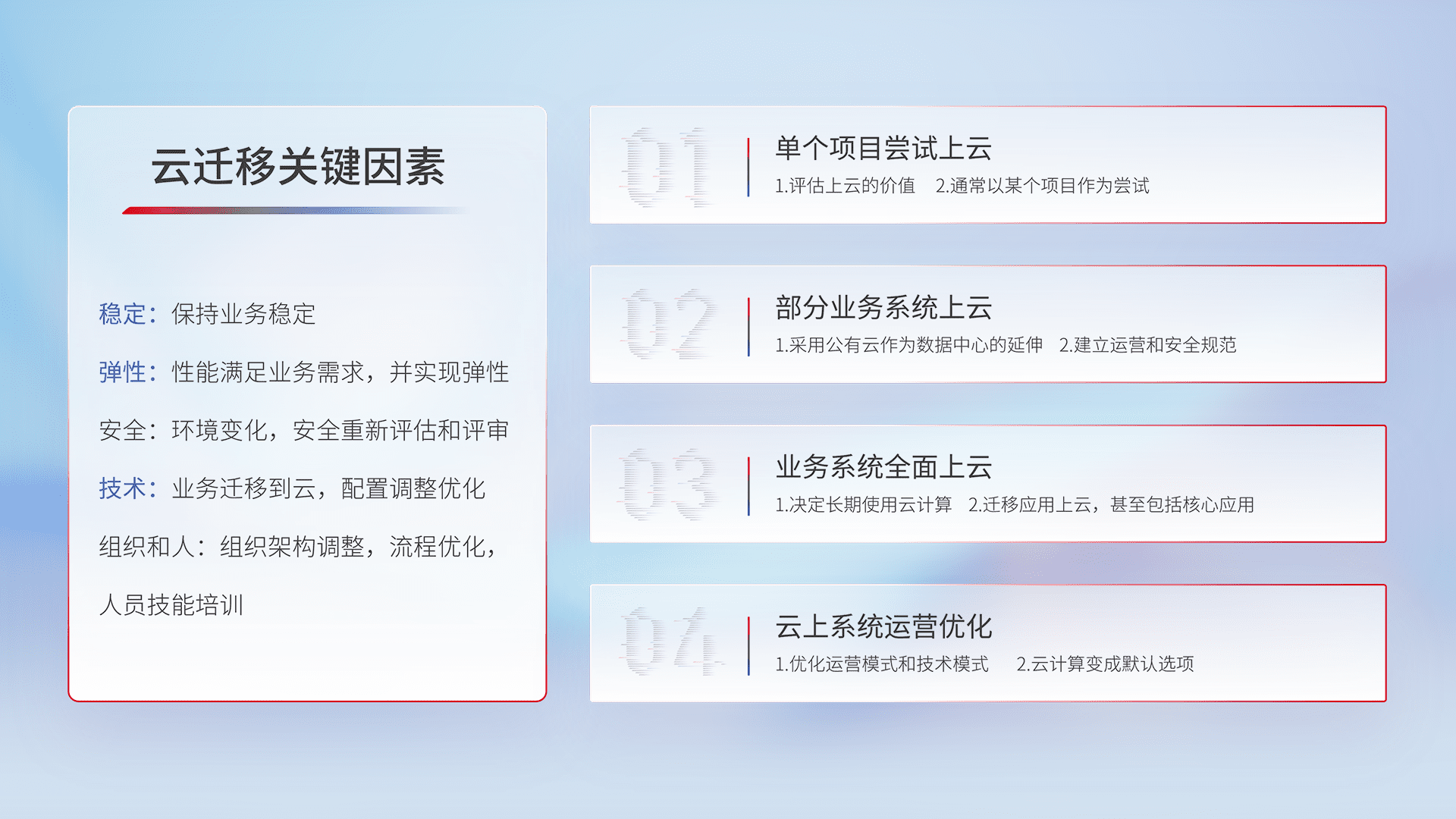 结合实际业务,,,从规划设计、、、、云平台选型、、云原生改造、、、数据迁移、、、、集成交付,,,迁移全过程为客户识别最佳上云路径,,做好风险识别管理,,设计网络架构、、、身份权限、、、、安全审计合规、、操作审计、、、、日志审计、、监控告警策略、、多站点容灾设计等,,,对云上基础设施进行整体规划,,,,提升IT治理水平,,以满足弹性、、、、高可用、、、、高性能的需求。。。。