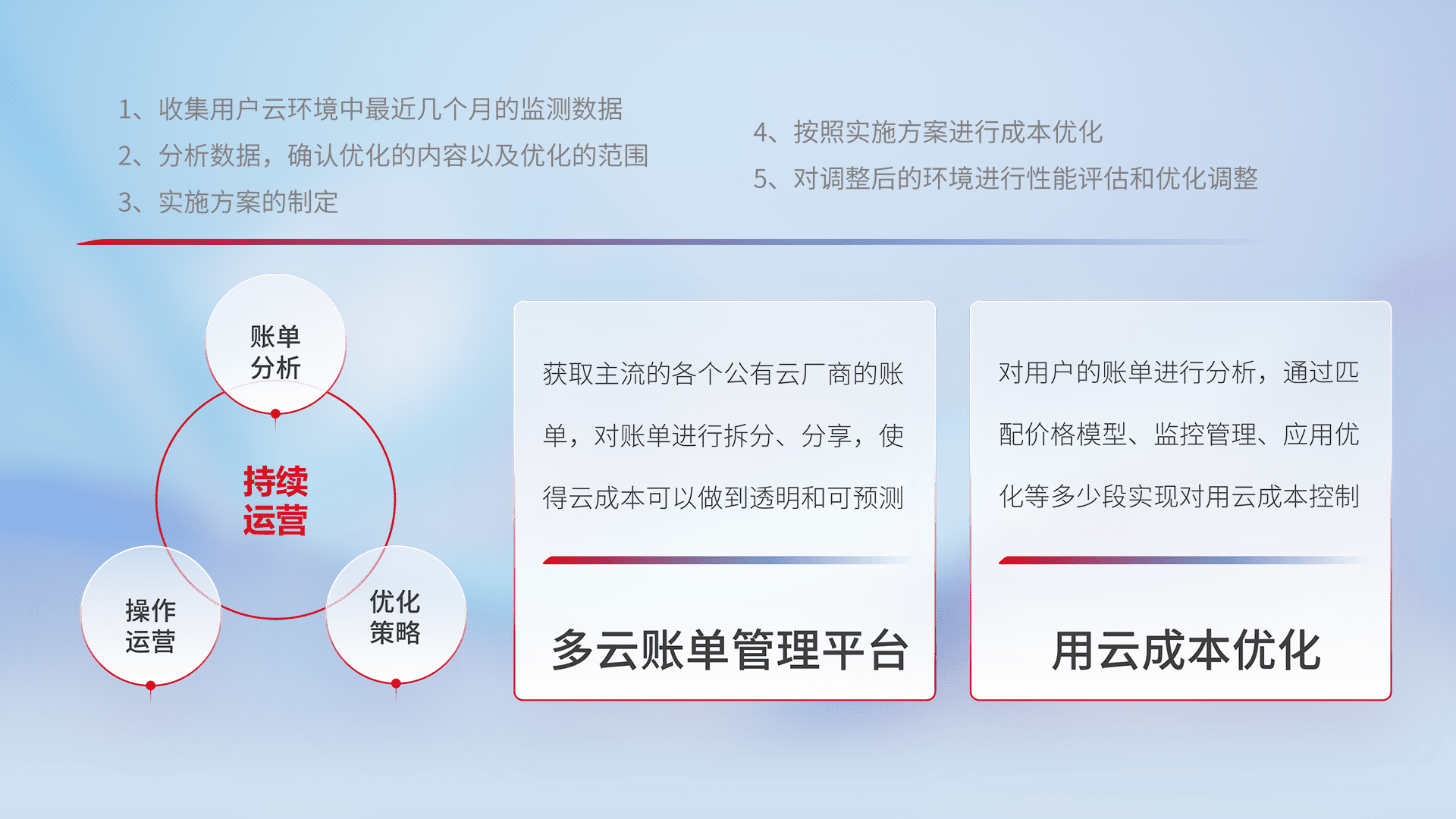 通过多云纳管,,,,以统一的资源数据模型把客户的云资源进行抽象和封装,,,,进而实现对多云资源的统一操作,,保障云资源管理的可靠性、、、稳定性与可用性。。量身定制化运维内容,,配置、、开发运维、、、、补丁管理、、、备份、、、监控、、认证和访问管理、、、审计和日常巡检等,,,,保障在用云过程中的可靠度,,,稳定度以及高可用率。。。