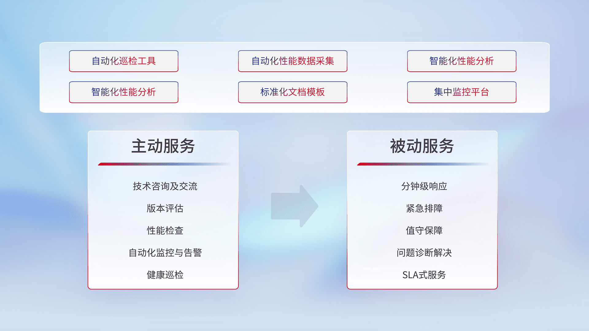 智能化工具和标准化文档,,保障服务质量,,,,提供主动服务(包含技术咨询、、、版本评估、、、性能检查、、自动化监控与告警、、健康巡检)和被动服务包含(分钟级响应、、紧急排障、、、值守保障、、问题诊断解决、、SLA服务)。。